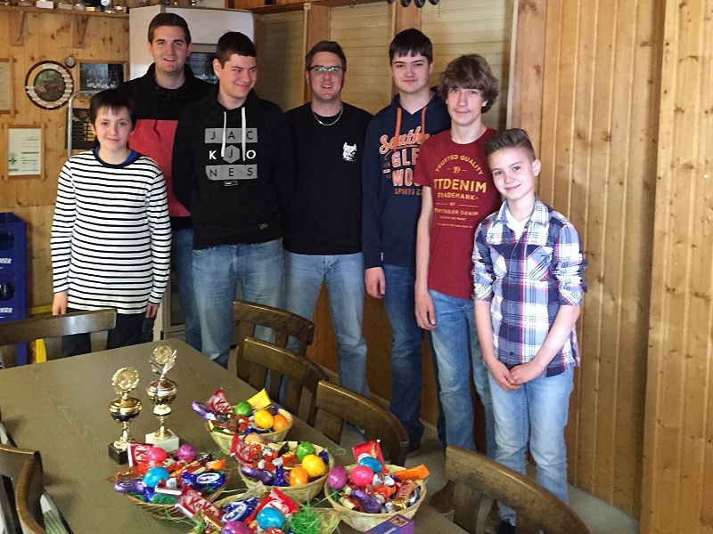 Die Trainer der Rübenacher Jungschützen Marco Riehl (2.v. links) und Stefan Doetsch (Mitte) luden ihre Jungschützen zum traditionellen „Ostereierschießen“ ein.