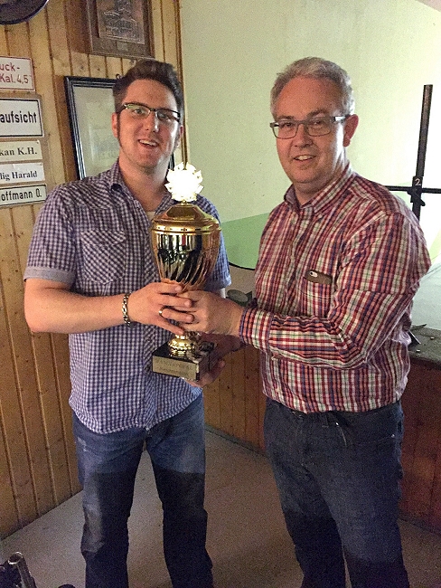 Stefan Doetsch (links) nimmt den Wanderpokal für den Vereinsmeister „Stern“ aus den Händen von Brudermeister Gerhard Riehl entgegen.
