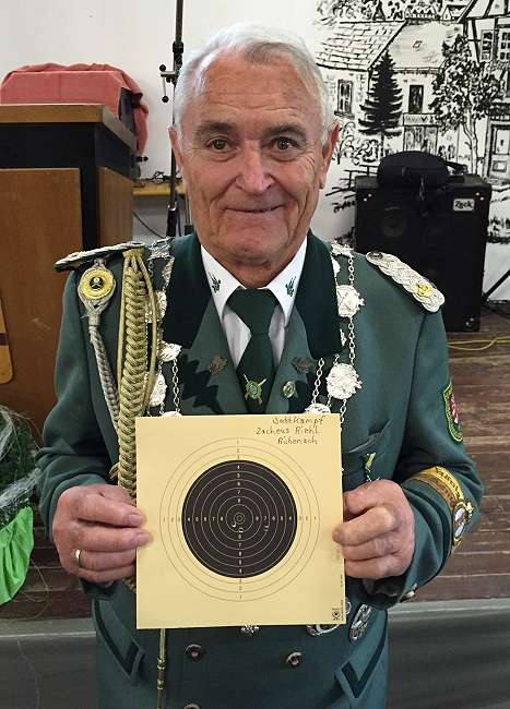 Höhepunkt war die Verkündung der Tagessieger am späten Nachmittag. Beim einzigen Team-Wettbewerb des Tages, dem Jakob-Klein-Gedächtnisschießen, sorgte die Rübenacher Bruderschaft für eine bislang wohl einmalige Konstellation beim Bezirksschießen: In der Besetzung Zacheus, Gerhard und Marco Riehl trat sie mit drei Generationen derselben Familie an. Leider reichte es mit 126 Ringen nur für einen abgeschlagenen zwölften Rang. Und auch beim „König der Könige“, einem Wettbewerb an dem alle aktiven Bezirkskönige der vergangenen Jahre teilnahmeberechtigt waren, war diesmal nichts zu holen. Nach zuletzt drei Rübenacher Titelträgern in Folge darf sich der Bezirkskönig von 2014, Karl-Heinz Steffes aus Vallendar, fortan für ein Jahr mit dem Titel schmücken. Dass die Rübenacher an diesem Tag noch ein erfreuliches Ergebnis zu verzeichnen hatten, verdankten sie ihrem Schützenkönig. Bereits am frühen Morgen trat er gegen 14 andere Schützenkönige des Bezirks an. Bei der Siegerehrung rief Bezirksbundesmeister Achim Berens den Namen des 82-jährigen Königs erst als Drittletztes auf und würdigte die Leistung eines der ältesten Teilnehmer des Schießens nochmal ausdrücklich.