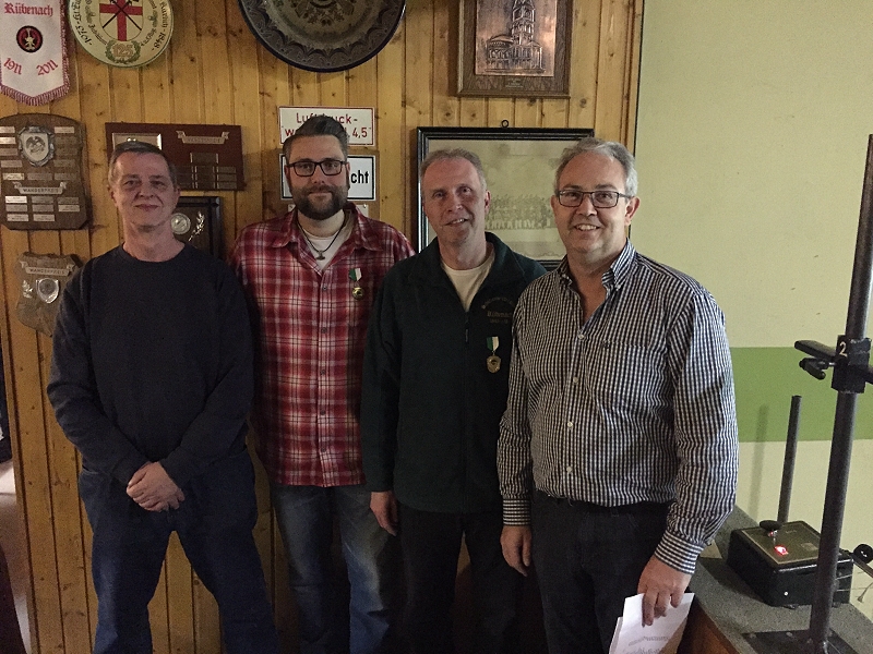 Die Sieger des Abends: Kai Weißenbrunn (2. von links) gewann den Titel auf Teiler, Jürgen Marzi (2. von rechts) den Wettkampf auf den Stern. Es gratulieren Brudermeister Gerhard Riehl (rechts) und Schießmeister Karl-Heinz Pelikan.