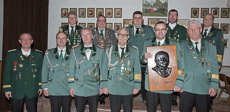 Foto v.li.: Bezirksbundesmeister Achim Berens, Norbert Alsbach, Walter Roos, Jürgen Marzi, Bezirkskönig Heiko Schmidt, Gerhard Riehl, Eric Stumm, Harald Ohlig, Jürgen Klamser, Werner Mohrs, Jürgen Lischke