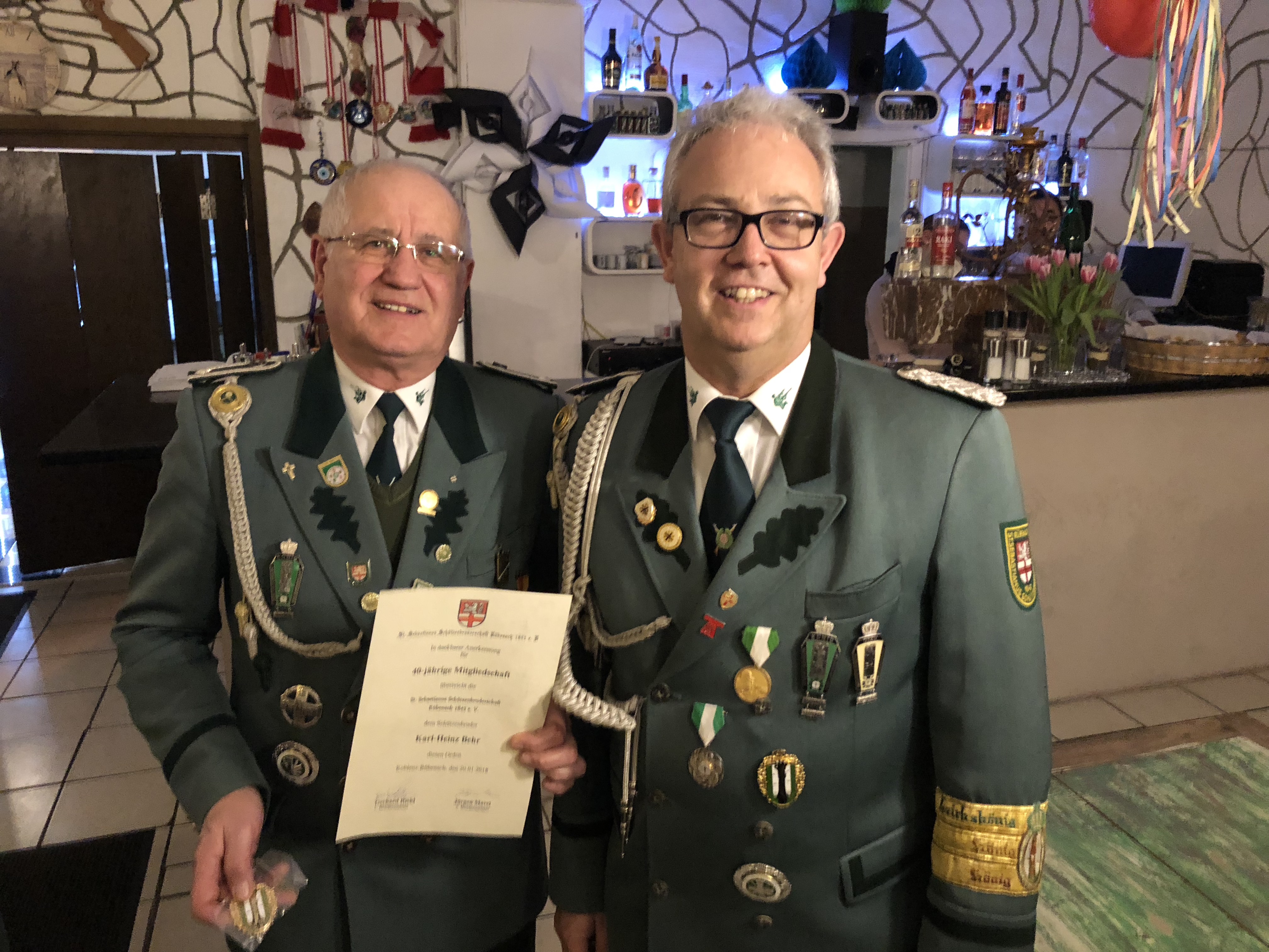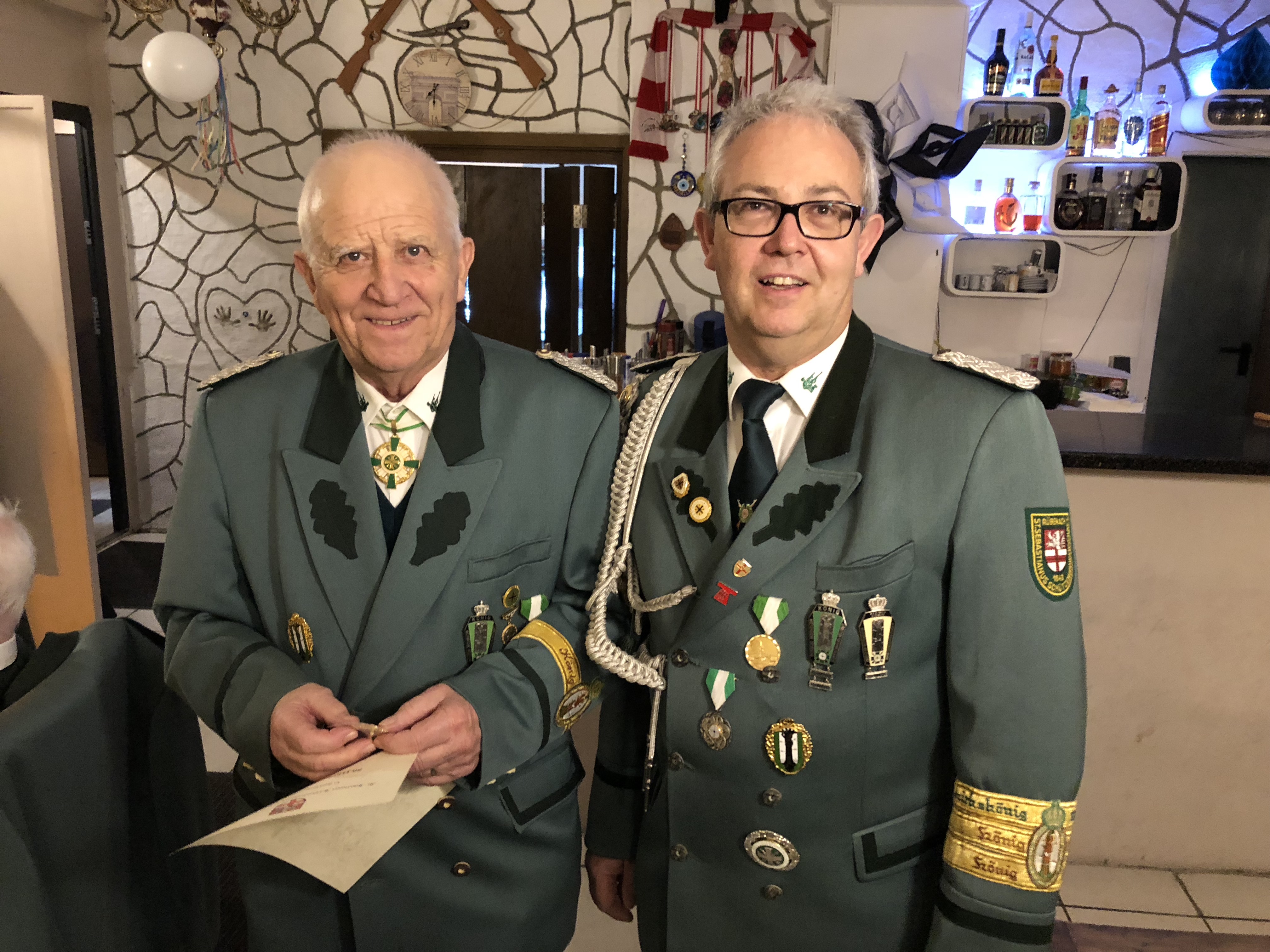 Noch ein „40-Jähriger“! Lange Jahre war Karl-Heinz Behr als Zugführer der vorderste Mann bei unseren Umzügen. Für seine Verdienste um die Bruderschaft erhielt er Anfang 2014 den Hohen Bruderschaftsorden des Bundes der Historischen Schützenbruderschaft. Nur wenige Monate später wurde er mit der Sportehrennadel der Stadt Koblenz ausgezeichnet. Unserem Verein hält er seit 1978 die Treue. Brudermeister Gerhard Riehl zeichnete ihn am Samstag für 40 Jahre Mitgliedschaft bei den Rübenacher Schützen aus.