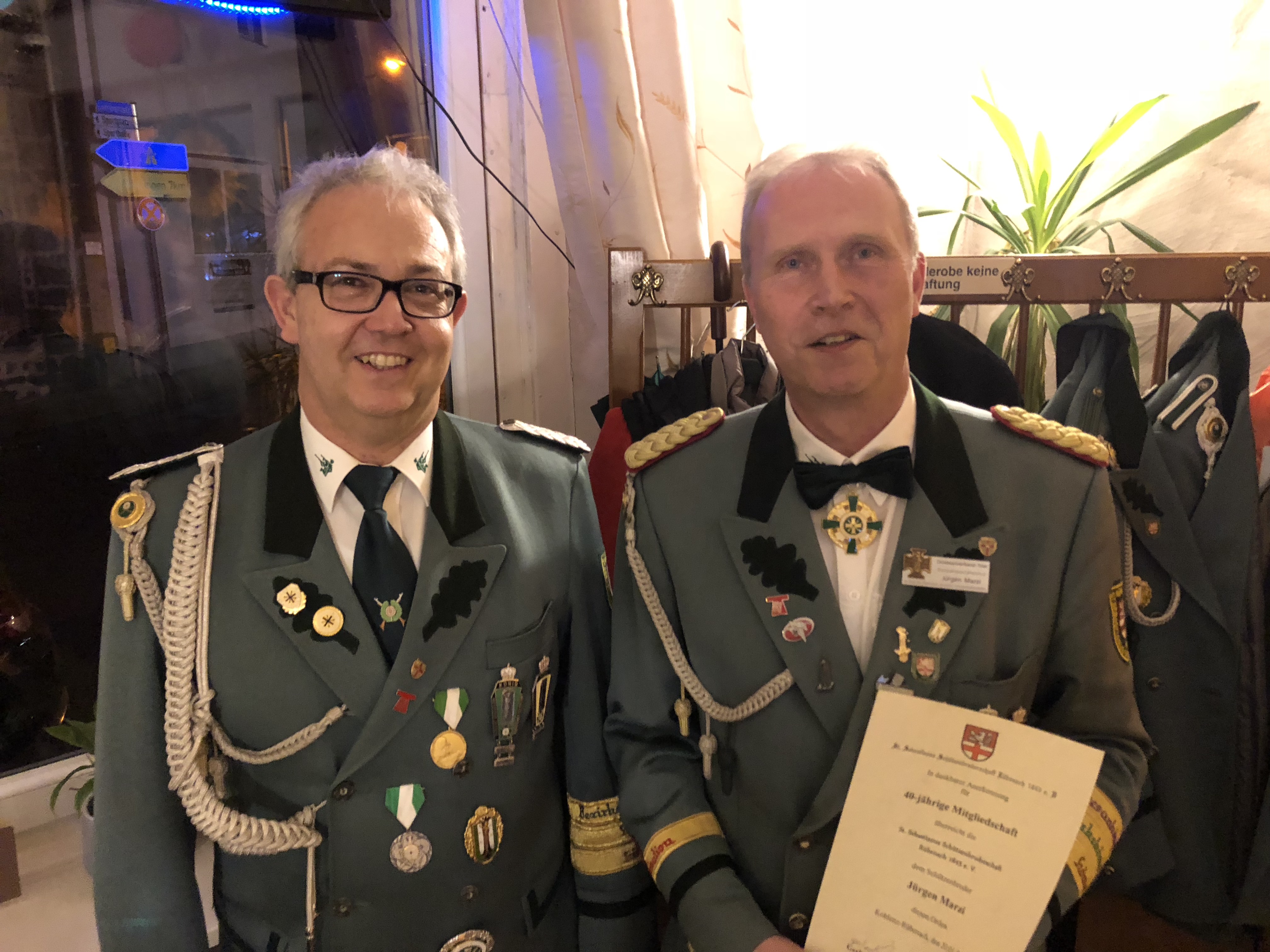 Als 2. Brudermeister ist Jürgen Marzi einer der wichtigsten Männer in unserem Verein. Darüber hinaus ist er sogar im Diözesanvorstand tätig. 2003 feierte er als Diözesankönig seinen größten Triumph als Schütze. Bereits 1978 ist er den Rübenacher Schützen beigetreten und wurde daher nun für 40 Jahre Mitgliedschaft ausgezeichnet. Am Samstag nahm er die Ehren-Urkunde aus den Händen unseres Brudermeisters Gerhard Riehl entgegen.