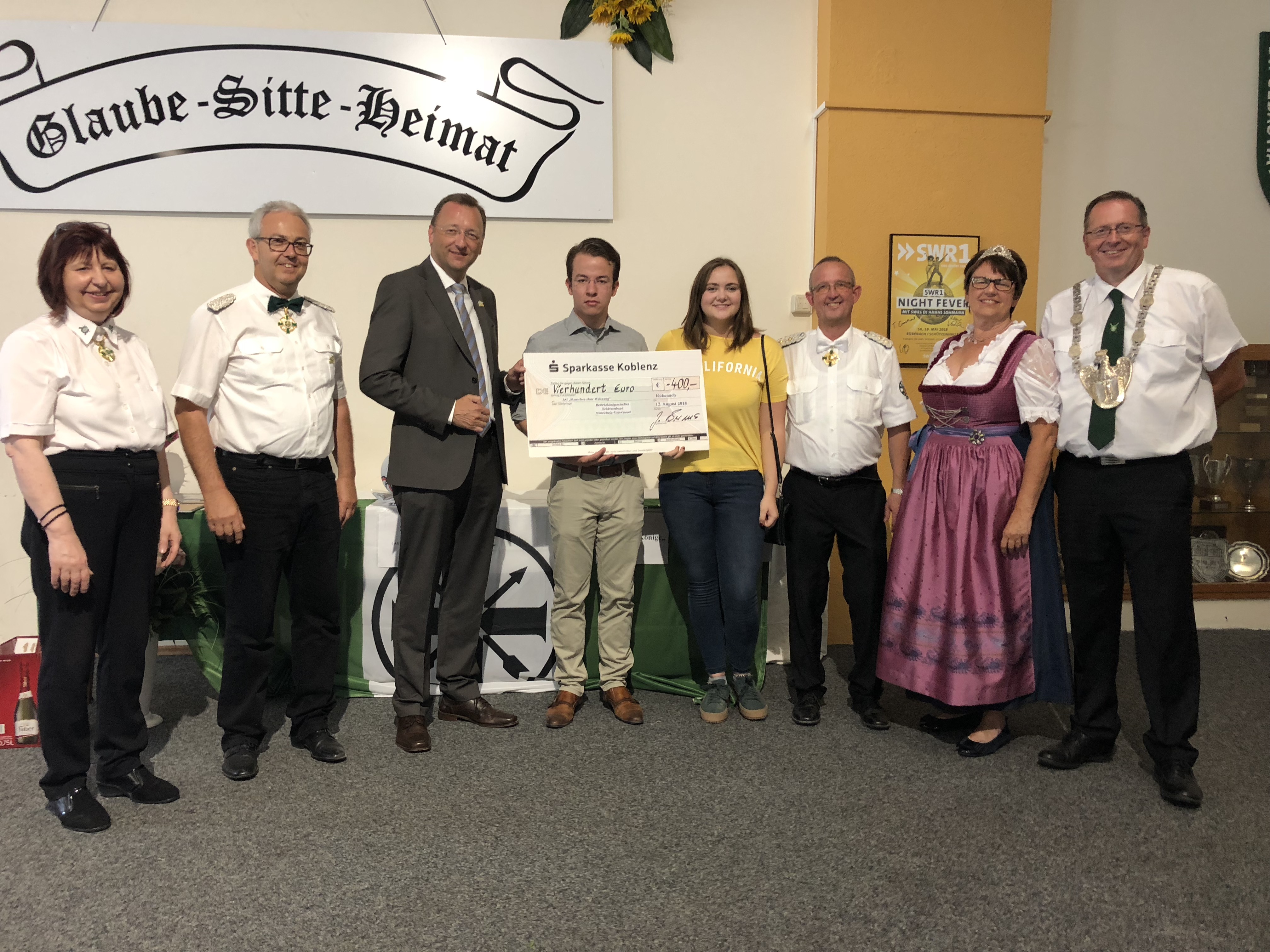 Am Sonntag trafen sich die 17 Schützenvereine des Bezirks Mittelrhein-Untermosel zum Bezirkskönigsschießen. Mit dem parallel ausgetragenen Jakob-Klein-Gedächtnisschießen fand außerdem ein Mannschaftswettbewerb statt. Zwar belegte die Rübenacher Mannschaft hier nur den 12. Platz, stellte aber mit Harald Ohlig den tagesbesten Schützen. Der Tag stand auch unter einem sozialen Aspekt: Das Antrittsgeld für den Sozialadler in Höhe von 200 Euro wurde der Schul-Arbeitsgemeinschaft „Menschen ohne Wohnung“ des Bischöflichen Cusanus-Gymnasiums Koblenz gespendet, bei der Schüler für Obdachlose kochen. Die Rübenacher Bruderschaft verdoppelte diesen Betrag nochmal, sodass insgesamt 400 Euro an zwei der ehrenamtlich tätigen Schüler überreicht werden konnten.