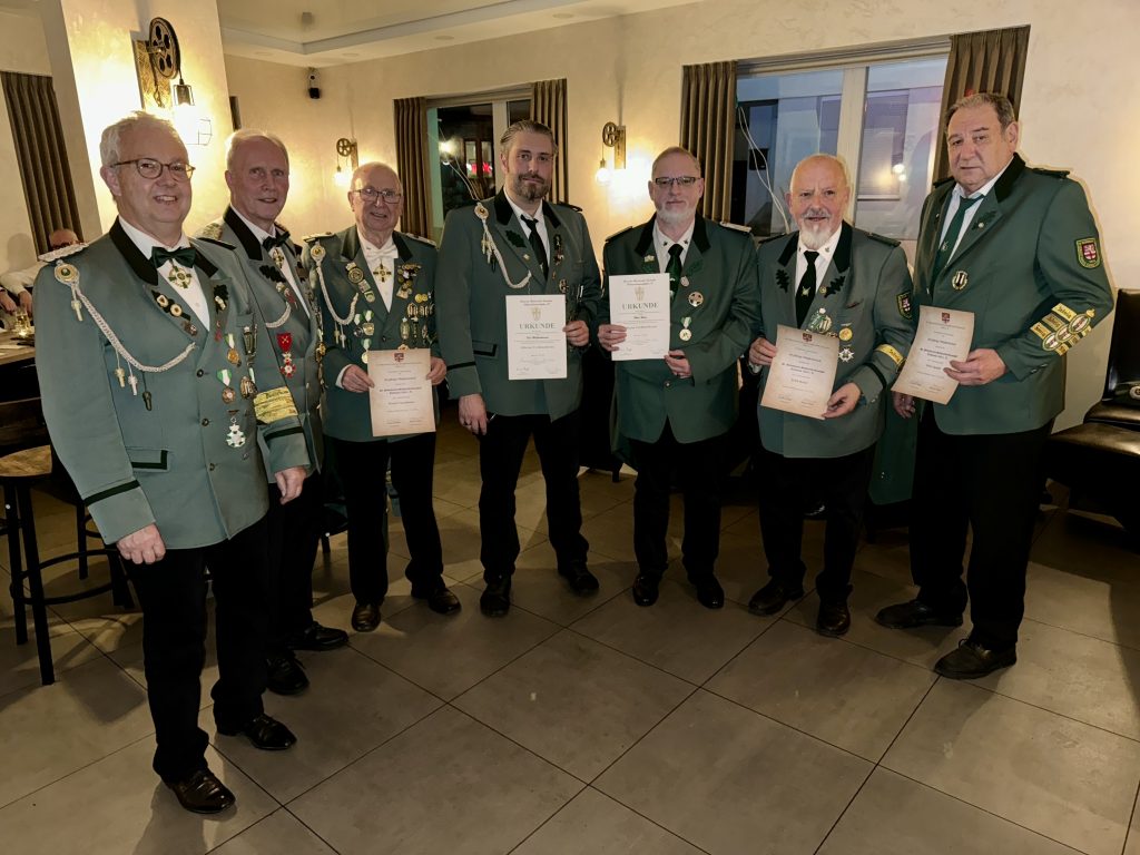 Die beiden Brudermeister Gerhard Riehl und Jürgen Marzi durften weitere Mitglieder auszeichnen: Gerhard Becker ist seit 40 Jahren aktiv, Werner Leyendecker seit 50 Jahren und Herbert Reif seit stolzen 60 Jahren. Zudem erhielten mit den langjährigen Vorstandsmitgliedern Theo Roos (1. Geschäftsführer) und Kai Weißenbrunn (1. Zugführer) zwei Schützen das Silberne Verdienstkreuz für ihre Verdienste um die Bruderschaft.